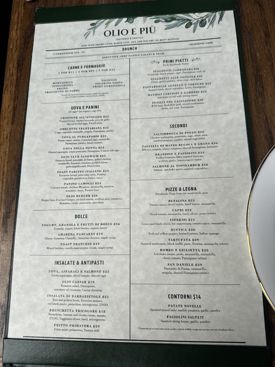 The brunch menu showcases a delectable selection of cured meats and cheeses, perfect for sharing. With remarkable reviews praising the pasta and attentive service, OLIO E PIÙ promises a culinary experience you won't forget.